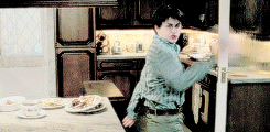 Harry wearing a Weasley jumper - Weasley jumpers: Harry received a homemade jumper every Christmas from Mrs Weasley. His were said to be much more extravagant, as Mrs Weasley "made much more effort" when her presents were not made for actual family members. The known jumpers he has include an emerald green one, a scarlet one, a green one with a Hungarian Horntail on the front, and one with a Golden Snitch on the front.