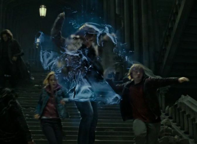 Harry casting a Shield Charm during the Battle of Hogwarts